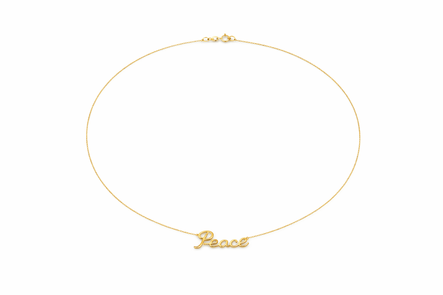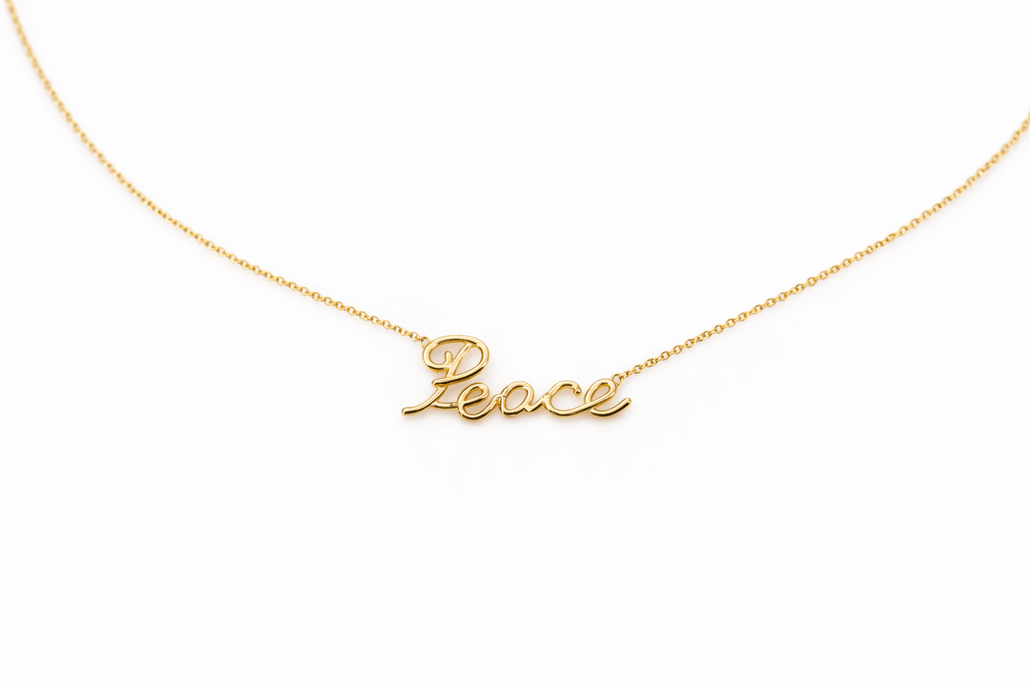 Gold necklace with 'Peace' pendant on a white background