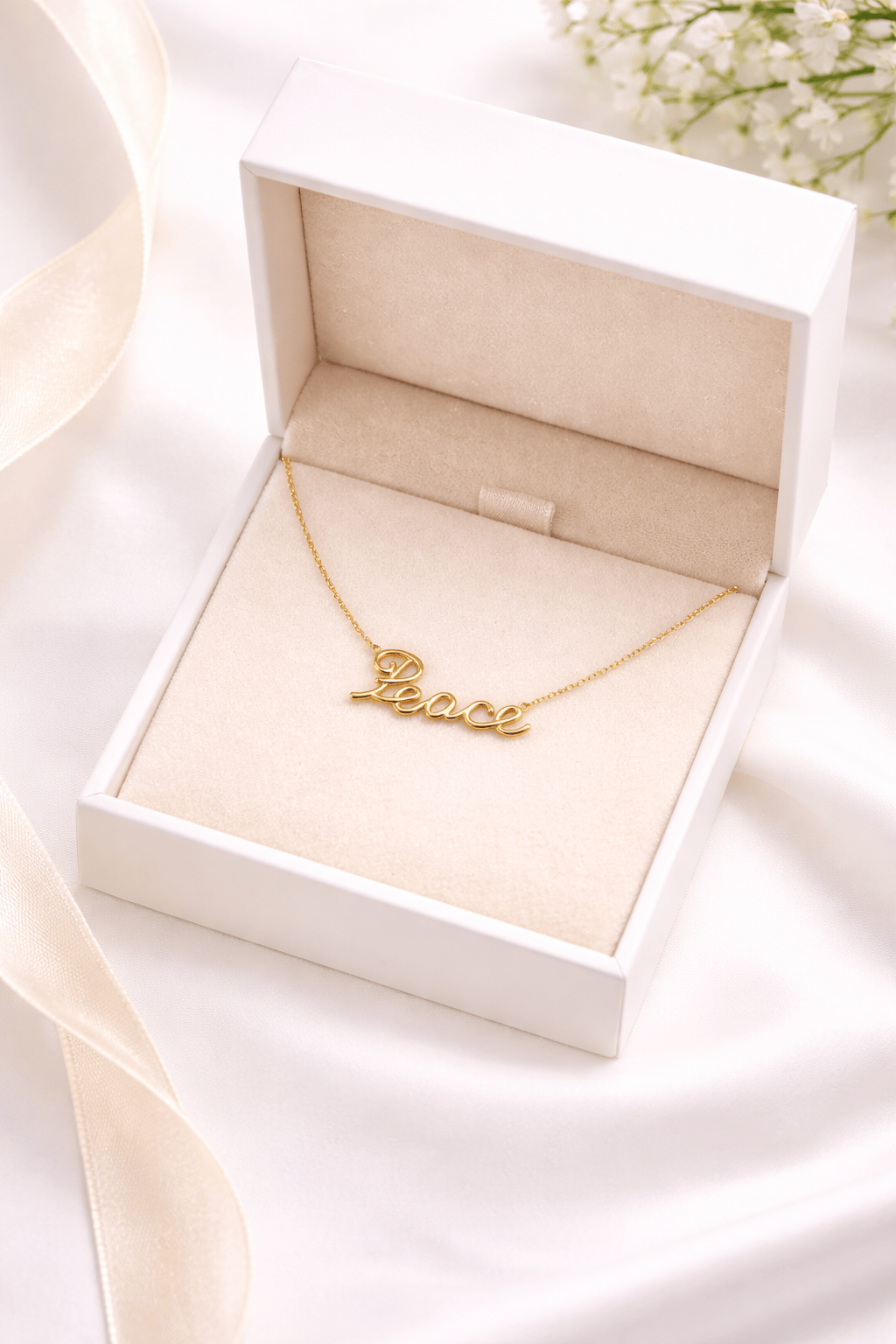 Gold necklace with 'Peace' pendant in a white box on a light background