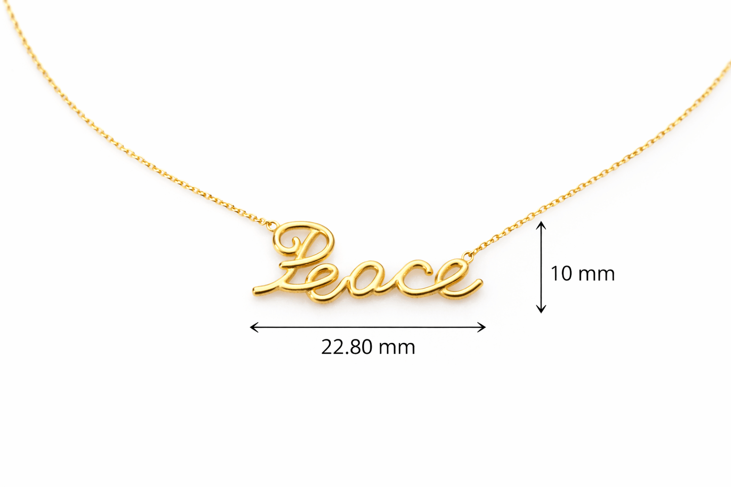 Gold necklace with 'Peace' pendant and measurements on a white background