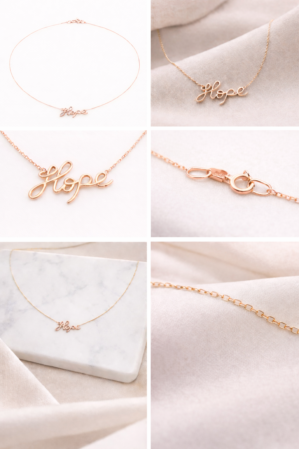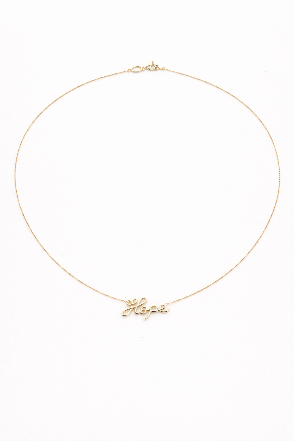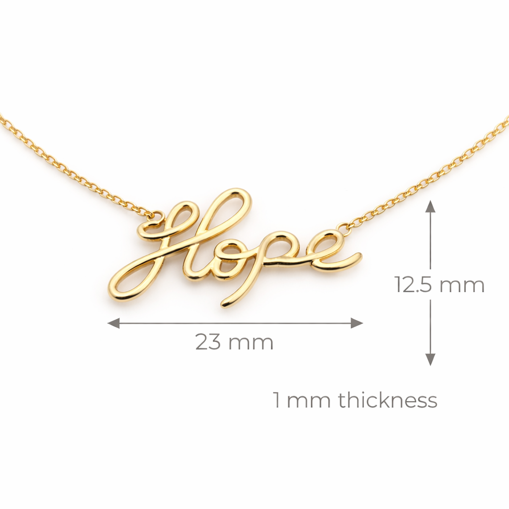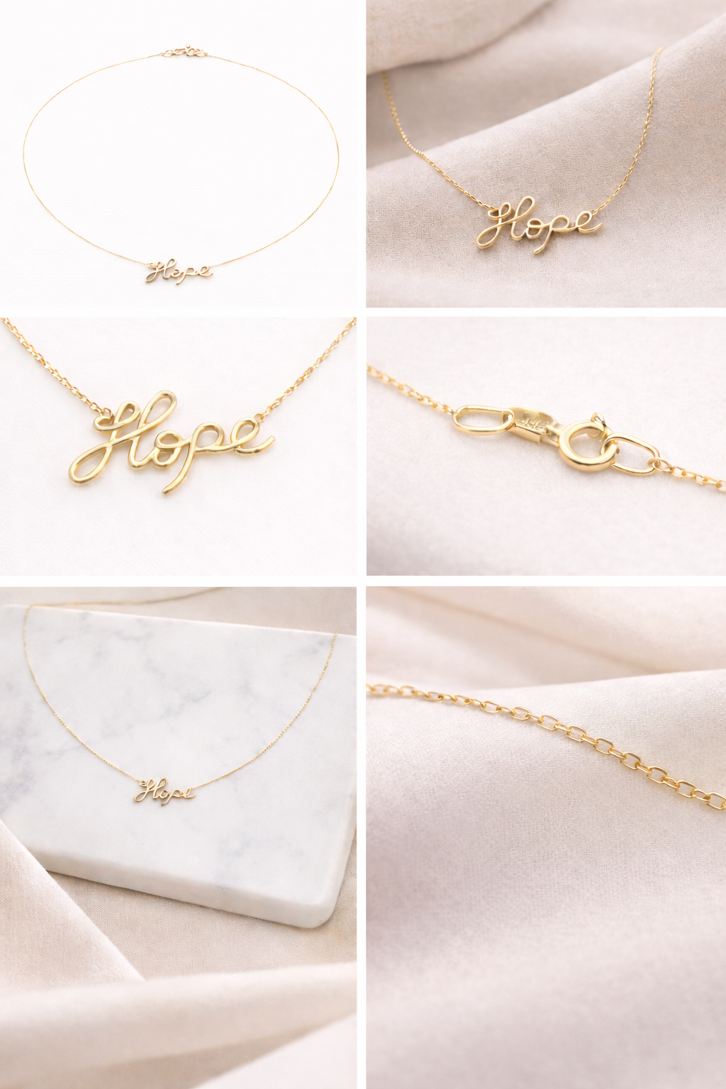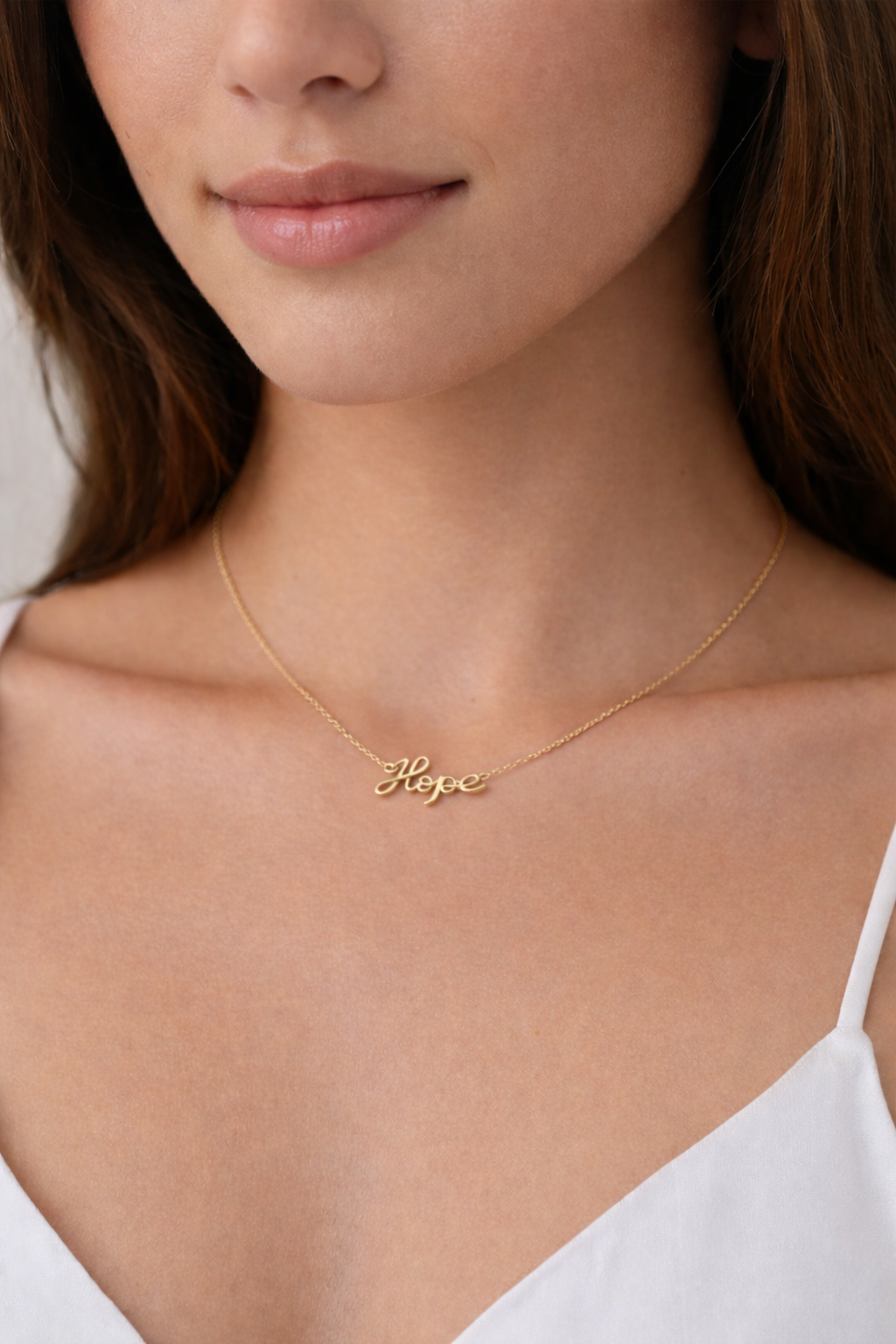 Carry a message of optimism close to your heart with our 14k Gold Script Hope Necklace. Handcrafted in elegant script lettering, this delicate piece embodies coastal elegance and timeless sentiment.