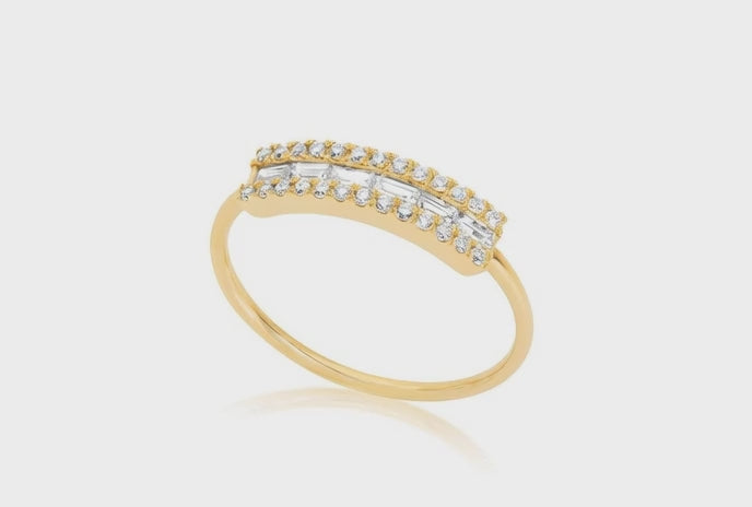 Regular price $1,165.00Unique minimalist women's diamond stacking ring in 14k solid gold. Micro pave set with six straight baguette diamonds and twenty-six round brilliant diamonds.