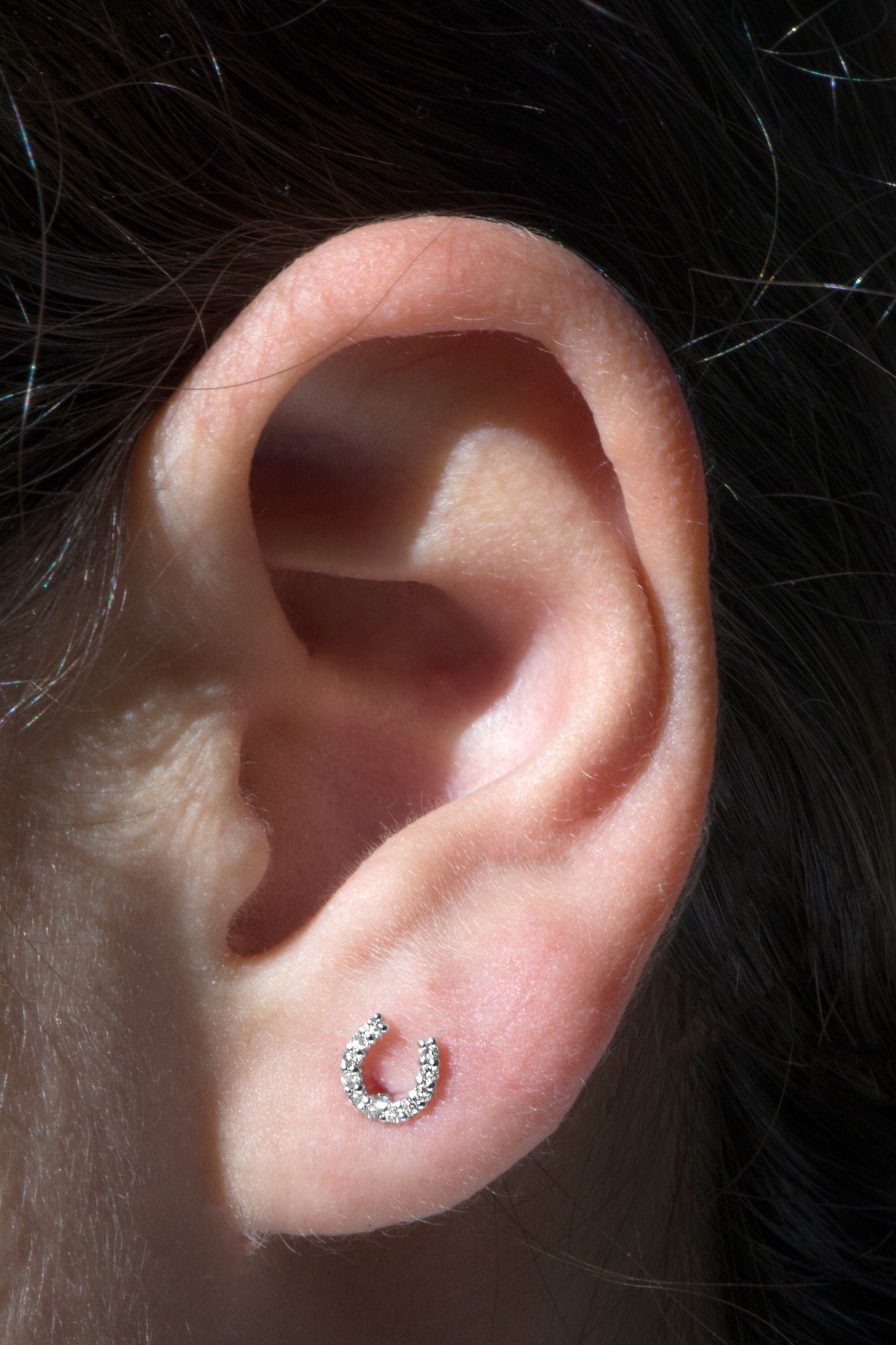 Stylish Diamond horseshoe stud earrings crafted of 14K gold, the earrings are secure with 14k friction backs. Many people around the world consider horseshoes to be lucky. We could all use a little extra luck in our lives Surprise your lucky charm with these trendy horseshoe diamond earrings.